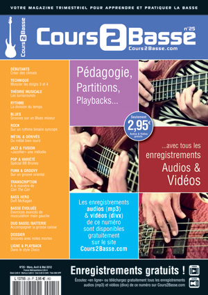 DEBUTANTS : Créer des climats. TECHNIQUE : Muscler les doigts 3 et 4. THEORIE : Les turnarounds. RYTHME : La division du temps. BLUES : Grooves sur un Blues mineur. ROCK : Sur un rythme binaire syncopé. METAL & DERIVES : Du métal bien lourd. JAZZ & FUSION : «Jazzifier» une mélodie. POP & VARIETE : Spécial BB Brunes. FUNK & GROOVY : Sur un groove oriental. TRANSCRIPTION : A la manière de Can The Can. BASS HERO : Duff McKagan. BASSE EVOLUEE : Exercices avancés de musculation main gauche. DUO BASSE/BATTERIE : Accompagner la grosse caisse. DOSSIER : Grooves avec notes mortes. SOLO & PLAYBACK : Dans le style Disco.