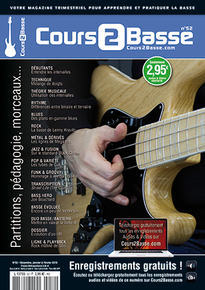 DEBUTANTS : Entendre les intervalles. TECHNIQUE : Mélange de doigts. THEORIE : Utilisation des intervalles. RYTHME : Différences entre binaire et ternaire. BLUES : Des plans en gamme blues. ROCK : La basse de Lenny Kravitz. METAL & DERIVES : Les lignes de Megadeth. JAZZ & FUSION : Sur le standard Black Coffee. POP & VARIETE : Les tubes de Cali. FUNK & GROOVY : Hommage à Aretha Franklin. TRANSCRIPTION : Street Life (The Crusaders). BASS HERO : Joe Bouchard. BASSE EVOLUEE : Encore un peu de technique. DUO BASSE/BATTERIE : Mettre en valeur la batterie. DOSSIER : Evolution d’un riff. LIGNE & PLAYBACK : Dans le style Rock mâtiné de Soul.