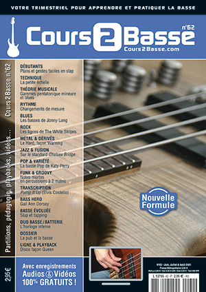 DEBUTANTS : Plans et gestes faciles en slap. TECHNIQUE : La petite échelle. THEORIE : Gammes pentatonique mineure et blues. RYTHME : Changements de mesure. BLUES : Les basses de Jonny Lang. ROCK : Les lignes de The White Stripes. METAL & DERIVES : Le Hard, façon Warning. JAZZ & FUSION : Sur le standard Chelsea Bridge. POP & VARIETE : La basse Pop de Katy Perry. FUNK & GROOVY : Notes mortes en percussions à 2 mains. TRANSCRIPTION : Pump It Up (Elvis Costello). BASS HERO : Gail Ann Dorsey. BASSE EVOLUEE : Slap et tapping. DUO BASSE/BATTERIE : L’horloge interne. DOSSIER : La pub et la basse. LIGNE & PLAYBACK : Dans le style Disco façon Queen.