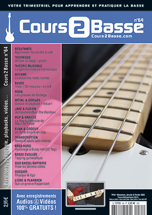 DEBUTANTS : Apprivoiser les cordes à vide. TECHNIQUE : Utiliser un doigt « pivot ». THEORIE : La gamme mineure harmonique. RYTHME : La place des notes mortes. BLUES : Trois « 12 mesures » en 5/4. ROCK : Les grooves de Garbage. METAL & DERIVES : Groove et playback « Indus ». JAZZ & FUSION : Somewhere Over The Rainbow. POP & VARIETE : La Pop québécoise de Cœur de Pirate. FUNK & GROOVY : Un Funk binaire en slap. TRANSCRIPTION : Basse et spots publicitaires. BASS HERO : Hommage à Dusty Hill (ZZ Top). BASSE EVOLUEE : Tapping guitaristique. DUO BASSE/BATTERIE : Viser les bonnes cibles.