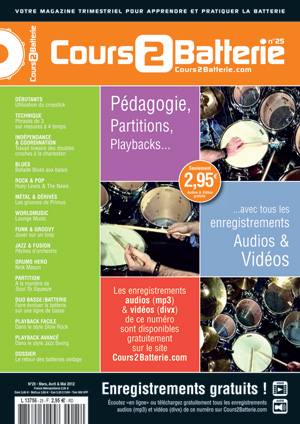 DEBUTANTS : Utilisation du crosstick. TECHNIQUE : Phrasés de 3 sur mesures à 4 temps. INDEPENDANCE & COORDINATION : Travail linéaire des doubles croches à la charleston. BLUES : Ballade Blues aux balais. ROCK & POP : Huey Lewis & The News. METAL & DERIVES : Les grooves de Primus. WORLDMUSIC : Lounge Music. FUNK & GROOVY : Jouer sur un loop. JAZZ & FUSION : Pêches d’orchestre. DRUMS HERO : Nick Mason. PARTITION : A la manière de Soul To Squeeze. DUO BASSE/BATTERIE : Faire évoluer la batterie sur une ligne de basse. PLAYBACK FACILE : Dans le style Slow Rock. PLAYBACK AVANCE : Dans le style Jazz Swing. DOSSIER : Le retour des batteries vintage.