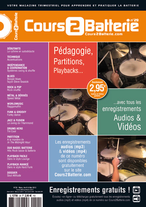 DEBUTANTS : Le rythme en autodidacte. TECHNIQUE : Accentuations. INDEPENDANCE & COORDINATION : Systèmes swing & shuffle. BLUES : Boogie blues façon Steve Seasick. ROCK & POP : Rock shuffle. METAL & DERIVES : Speed Métal. WORLDMUSIC : Raggamuffin. FUNK & GROOVY : Funky dance. JAZZ & FUSION : Le swing de l’Hammond. DRUMS HERO : Tré Cool. PARTITION : A la manière de In The Midnight Hour. DUO BASSE/BATTERIE : Hits Rock basse & batterie. PLAYBACK FACILE : Dans le style Lounge. PLAYBACK AVANCE : Dans le style Hard Funk. DOSSIER : Soul Attitude.