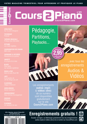 DEBUTANTS : Sur le pont d'Avignon. TECHNIQUE : Pizzicati. THEORIE : Pratique des intervalles. RYTHME : Les notes répétées. COORDINATION DES MAINS : Méli-mélo. HARMONIE & ACCORDS : Résolutions de quartes. VARIETE : A la façon d'un tube. BLUES : Plan facile sur accords septièmes. POP & ROCK : Dans le style Rock FM. JAZZ : A la manière de All The Things You Are. CLASSIQUE : Adagio d'Albinoni. WORLDMUSIC : Danse roumaine. ARRANGEMENT : Deux formes d'arrangement. DOSSIER : Wolfgang. PLAYBACK : Un standard de Jazz.