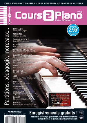 DEBUTANTS : Initiation au legato. TECHNIQUE : Arpèges séparés. THEORIE : Les voix des accords. RYTHME : Avec des petites syncopes. COORDINATION DES MAINS : Des croches sans anicroches. HARMONIE & ACCORDS : La quinte augmentée. VARIETE : Des plans « passe-partout ». BLUES : Une grille de Blues en Ré mineur. POP & ROCK : Du Rap, façon PNL. JAZZ : Now’s The Times (Charlie Parker). CLASSIQUE : Un exercice préparatoire. WORLD MUSIC : Sur un mode éolien. ARRANGEMENT & PROGRAMMATION : Organiser les instruments. DOSSIER : Avec la neuvième augmentée. PLAYBACK : Ensemble sur une grille tonale.