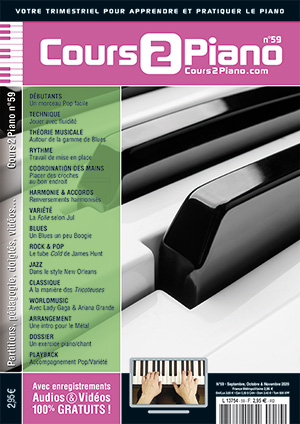 DEBUTANTS : Un morceau Pop facile. TECHNIQUE : Jouer avec fluidité. THEORIE : Autour de la gamme de Blues. RYTHME : Travail de mise en place. COORDINATION DES MAINS : Placer des croches au bon endroit. HARMONIE & ACCORDS : Renversements harmonisés. VARIETE : La Folie selon Jul. BLUES : Un Blues un peu Boogie. POP & ROCK : Le tube Cold de James Hunt. JAZZ : Dans le style New Orleans. CLASSIQUE : A la manière des Tricoteuses. WORLD MUSIC : Avec Lady Gaga & Ariana Grande. ARRANGEMENT & PROGRAMMATION : Une intro pour le Métal. DOSSIER : Un exercice piano/chant. PLAYBACK : Accompagnement Pop/Variété.