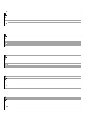 In dieses unbeschriebene Notenpapier können Sie den Gitarren-Part in Notenlinien-Schreibweise im G-Schlüssel und in Tabulatur-Schreibweise eintragen.