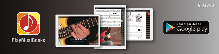 Todos los métodos de guitarra presentados aquí, cuyo catálogo se puede descargar con un simple clic, corresponden exactamente a los que se venden en las tiendas de música, pero optimizados para smartphones y tabletas Android. Directamente podrás descargarlos desde la aplicación PlayMusiBooks en tu dispositivo Android... y después trabajarlos con una comodidad máxima. Así, desde las diferentes páginas que contiene cada método, el acceso a todas las grabaciones audios y/o vídeos se hace con un clic simple en los números correspondientes. Todo está al alcance de tus dedos... las partituras, los vídeos, el sonido y todas las explicaciones.