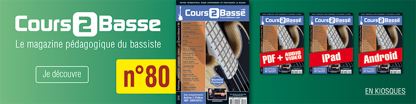 Disponible en kiosque tous les trimestres, soit 4 numéros par an, au prix modique de 2,95 euros, la revue pédagogique Cours 2 Basse comblera assurément toutes vos attentes, au travers de nombreuses rubriques dédiées à 100% à la basse (débutants, technique, rythme, théorie, blues, pop, rock, métal, jazz, funk, bass hero, partition, playback...), ainsi qu'aux enregistrements audios et vidéos correspondants, à télécharger gratuitement ou à consulter directement sur le site.