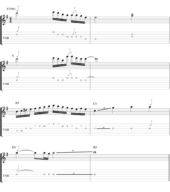 On se rend tout de suite compte, tant à l'écoute de l'exemple qu'en observant la partition, qu'on a affaire à un riff en Mi d'une mesure, une sorte de leitmotiv, que l'on transpose tout au long de la grille… de blues bien sûr !