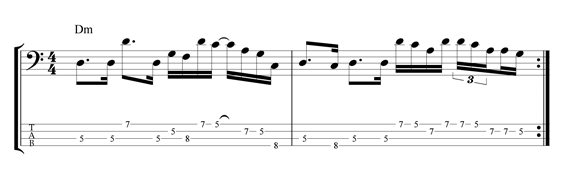 Si vous avez du mal à articuler cet exemple, c'est sans doute parce vous ne maîtrisez pas totalement la technique de découpage rythmique à la double croche, indispensable ici. Travaillez-la au besoin avec le cours multimédia correspondant.
