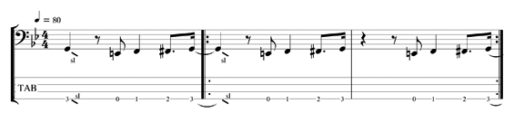 Il s'agit ici d'un enchaînement d'accords, ou plus exactement de triades majeures (C, G et F), sur près de 3 mesures, à jouer exclusivement sur les 3 cordes aiguës de la guitare La fin du riff s'articule pour sa part essentiellement sur les 4 cordes centrales, dans un registre un peu plus grave.
