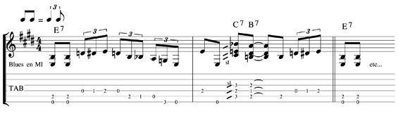 Ce cliché rock étant en Mi pentatonique mineur, les doubles notes, comme les notes "simples" d'ailleurs, appartiendront à cette gamme. Et plus précisément à la position 1 de la gamme mineure pentatonique de Mi, qui démarre à la case 12.