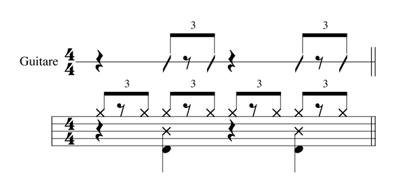 C'est à vous maintenant de travailler votre indépendance sur ces deux formules, tout d'abord à la caisse claire, puis à la grosse caisse. Entraînez-vous alors à distribuer la main gauche en triolets de noires sur toute la batterie avant de chercher à alterner la caisse claire et la grosse caisse selon le même principe.