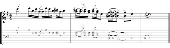 Avec les différentes techniques évoquées, vous disposez d’un «arsenal» intéressant pour agrémenter vos solos. Travaillez ainsi les 2 mesures ci-dessous qui résument l'ensemble : deux bends (de 1 ton) et un release bend (de 1/2 ton) dans la première mesure ; puis dans la seconde, un bend (de 1 ton) et un enchaînement d'un bend & release suivi d'un nouveau bend (1 ton), le tout dans la même attaque.