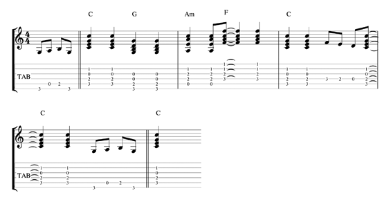 La partition ci-dessous correspond donc à l'introduction mais aussi au refrain du morceau. Aucune difficulté particulière, si ce n'est cette alternance entre des petits motifs en single notes (notes seules) et accords. D'une grande simplicité, les motifs en single notes se jouent à la croche de façon régulière. Les 4 accords utilisés (C, G, Am et F), pour leur part, sont tous des accords ouverts, dont on ne joue d'ailleurs pas toutes les notes, mais seulement 4 d'entre elles. On peut difficilement faire plus simple...
