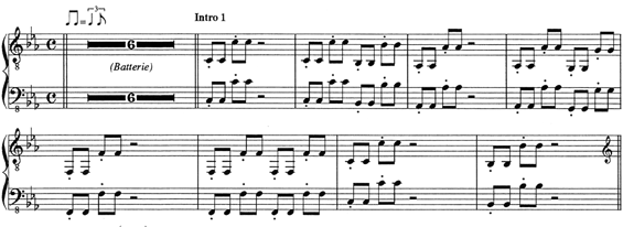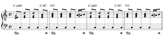 La basse, tenue par la main gauche, est pour sa part très “blues”. Très simple également, elle répète un même motif à base de noires d'un bout à l'autre de la partition.