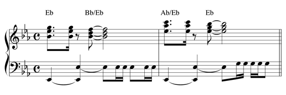 Comme bien souvent dans le style, on s’aperçoit que la main droite s’occupe des accords et la main gauche de la basse.