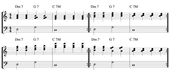 La technique du jeu en accords semi-arpégés consiste à répartir le travail entre les deux mains : la main droite s’occupe de la triade tandis que la main gauche se contente de marquer les basses, le plus généralement la tonique de l’accord.
