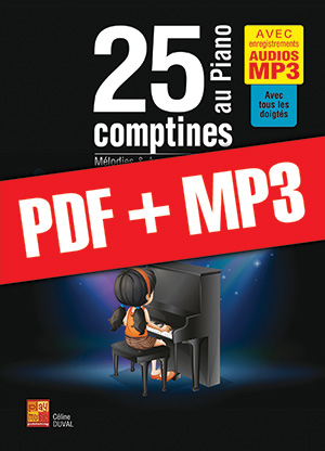 Cet ouvrage s’adresse à tous les pianistes qui souhaitent pouvoir jouer et chanter des comptines et autres chansons pour enfants. Que ce soit à la maison, en colonie de vacances, en centre aéré, en classe, ou ailleurs. Seul, en famille, ou entre amis. Accessibles aux pianistes de tous âges et tous niveaux, les 25 comptines pour piano que comporte ce recueil sont parmi les plus connues : à la claire fontaine, à la pêche aux moules, Maman les p’tits bateaux, Une souris verte, Nous n’irons plus au bois, Frère Jacques, Il était un petit navire, Il pleut il pleut bergère, J’ai du bon tabac, Meunier tu dors, Alouette, Pomme de reinette et pomme d’api, Le bon roi Dagobert, C’est la mère Michel... Pour chacune d’elles, vous trouverez non seulement la mélodie (main droite), mais aussi l’accompagnement (main gauche) ainsi que l’ensemble des paroles. Et pour aider les plus jeunes ou les plus débutants, les indications de doigts (doigtés) accompagnent toutes les notes de ce recueil, sans exception ! Mais cet ouvrage n’aurait pas été complet sans les enregistrements MP3 qui l’accompagnent. Ainsi, vous trouverez sur ces derniers, et ce pour chaque comptine, trois pistes audios différentes. Celles-ci vous permettront d’entendre distinctement les deux parties (mélodie et accompagnement) séparées puis jouées ensemble, et vous donneront aussi l’occasion de jouer sur les playbacks de chacune d’elles, la partie manquante.