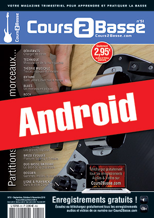 Le Cours 2 Basse n°51 en version Android. DEBUTANTS : Changer de corde. TECHNIQUE : Musculation de la main gauche. THEORIE : Tierces majeure et mineure. RYTHME : Sans jamais jouer sur le temps. BLUES : Un morceau en picking. ROCK : Du Rock « énervé ». METAL & DERIVES : Spécial Alice In Chains. JAZZ & FUSION : Sur le thème de Mas Que Nada. POP & VARIETE : Les tubes de l’été. FUNK & GROOVY : Tester des mises en place. TRANSCRIPTION : 7 T’s de Marcus Miller. BASS HERO : Les grands disparus. BASSE EVOLUEE : Plans en tapping à 2 mains. DUO BASSE/BATTERIE : Le débit de la charleston. DOSSIER : Gammes, modes et couleurs. LIGNE & PLAYBACK : Dans le style Dance 70’s.