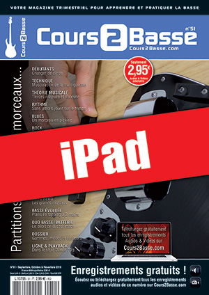 Le Cours 2 Basse n°51 sur iPad. DEBUTANTS : Changer de corde. TECHNIQUE : Musculation de la main gauche. THEORIE : Tierces majeure et mineure. RYTHME : Sans jamais jouer sur le temps. BLUES : Un morceau en picking. ROCK : Du Rock « énervé ». METAL & DERIVES : Spécial Alice In Chains. JAZZ & FUSION : Sur le thème de Mas Que Nada. POP & VARIETE : Les tubes de l’été. FUNK & GROOVY : Tester des mises en place. TRANSCRIPTION : 7 T’s de Marcus Miller. BASS HERO : Les grands disparus. BASSE EVOLUEE : Plans en tapping à 2 mains. DUO BASSE/BATTERIE : Le débit de la charleston. DOSSIER : Gammes, modes et couleurs. LIGNE & PLAYBACK : Dans le style Dance 70’s.
