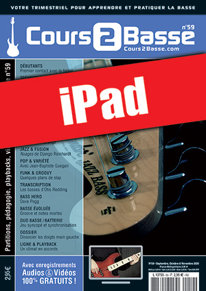 Le Cours 2 Basse n°59 sur iPad. DEBUTANTS : Premier contact avec la basse. TECHNIQUE : Les doigtés de la main droite. THEORIE : La liaison. RYTHME : Le binaire-ternaire. BLUES : Grilles basiques de 12 mesures. ROCK : Hommage à Little Richard. METAL & DERIVES : Un playback Grunge. JAZZ & FUSION : Nuages de Django Reinhardt. POP & VARIETE : Avec Jean-Baptiste Guegan. FUNK & GROOVY : Quelques plans de slap. TRANSCRIPTION : Les basses d’Otis Redding. BASS HERO : Dave Pegg. BASSE EVOLUEE : Groove et notes mortes. DUO BASSE/BATTERIE : Jeu syncopé et synchronisation. DOSSIER : Dissocier les doigts main gauche. LIGNE & PLAYBACK : Un climat en accords.
