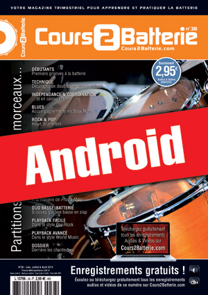 Le Cours 2 Batterie n°38 en version Android. DEBUTANTS : Premiers grooves à la batterie. TECHNIQUE : Décalages de doubles en grosse caisse. INDEPENDANCE & COORDINATION : ... et en caisse claire. BLUES : Accompagnements en Slow Blues. ROCK & POP : Heart drummers. METAL & DERIVES : L’album Rock Or Bust d’AC/DC. WORLDMUSIC : Les rythmes du Jensa. FUNK & GROOVY : Enrichir un groove pour la Funk. JAZZ & FUSION : Travail d’une phrase syncopée. DRUMS HERO : Joey Waronker. PARTITION : A la manière de Proud Mary. DUO BASSE/BATTERIE : Grooves sur une basse en slap. PLAYBACK FACILE : Dans le style Pop/Rock. PLAYBACK AVANCE : Dans le style World Music. DOSSIER : Derrière les chanteuses.