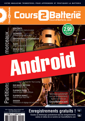 Le Cours 2 Batterie n°40 en version Android. DEBUTANTS : Echauffement mains & pieds. TECHNIQUE : Orchestrations du ra de 3. INDEPENDANCE & COORDINATION : Groupes de notes. BLUES : A la manière de Bo Diddley. ROCK & POP : Avec KT Tunstall. METAL & DERIVES : Le Rock/Hard de Lenny Kravitz. WORLDMUSIC : Le rythme Nanigo. FUNK & GROOVY : Les grooves de Rick Latham. JAZZ & FUSION : Indépendances ternaires. DRUMS HERO : Dominic Howard (Muse). PARTITION : A la manière de Fool For Your Loving. DUO BASSE/BATTERIE : Chad Smith & Flea. PLAYBACK FACILE : Dans le style Country Blues. PLAYBACK AVANCE : Dans le style Hard FM. DOSSIER : Installation et réglage de la batterie.