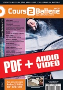 Le Cours 2 Batterie n°74 en version optimisée pour Android. DEBUTANTS : S’installer correctement. TECHNIQUE : Le travail du Stick Control. INDEPENDANCE & COORDINATION : Reproduction d’un rythme. BLUES : Accents de charleston en ternaire. ROCK & POP : Une sélection Best of Rock. METAL & DERIVES : Les grooves de The Dead Daisies. WORLDMUSIC : Le carnaval de Martinique. FUNK & GROOVY : Grooves funky et percussions. JAZZ & FUSION : Passer du swing au binaire. DRUMS HERO : Tommy Lee (Mötley Crüe). PARTITION : Un medley de Lady Gaga. DUO BASSE/BATTERIE : Half time, back beat et dédoublement. PLAYBACK FACILE : Dans le style Old Blues. PLAYBACK AVANCE : Dans le style Heavy Rock. DOSSIER : Comment relever une grille.