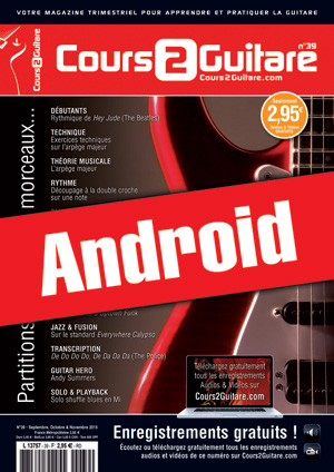 Le Cours 2 Guitare n°39 en version Android. DEBUTANTS : Rythmique de Hey Jude (The Beatles). TECHNIQUE : Exercices techniques sur l’arpège majeur. THEORIE : L’arpège majeur. RYTHME : Découpage à la double croche sur une note. BLUES : Travail autour de King For A Day. ROCK : Plans et clichés pour la guitare rock. METAL & DERIVES : Gamme majeure & jeu legato. ACOUSTIQUE : Les arpèges de Dust in the Wind (Kansas). FUNK & GROOVY : Les tourneries d’Uptown Funk. JAZZ & FUSION : Sur le standard Everywhere Calypso. TRANSCRIPTION : A la manière de De Do Do Do, De Da Da Da (The Police). GUITAR HERO : Andy Summers. SOLO & PLAYBACK : Dans le style shuffle blues en Mi.