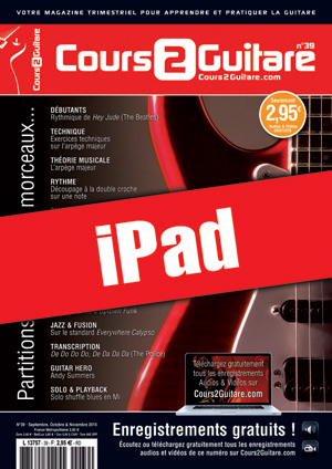 Le Cours 2 Guitare n°39 sur iPad. DEBUTANTS : Rythmique de Hey Jude (The Beatles). TECHNIQUE : Exercices techniques sur l’arpège majeur. THEORIE : L’arpège majeur. RYTHME : Découpage à la double croche sur une note. BLUES : Travail autour de King For A Day. ROCK : Plans et clichés pour la guitare rock. METAL & DERIVES : Gamme majeure & jeu legato. ACOUSTIQUE : Les arpèges de Dust in the Wind (Kansas). FUNK & GROOVY : Les tourneries d’Uptown Funk. JAZZ & FUSION : Sur le standard Everywhere Calypso. TRANSCRIPTION : A la manière de De Do Do Do, De Da Da Da (The Police). GUITAR HERO : Andy Summers. SOLO & PLAYBACK : Dans le style shuffle blues en Mi.