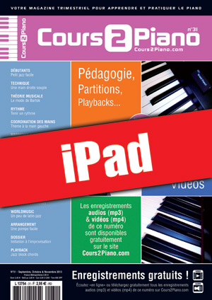 Le Cours 2 Piano n°31 sur iPad. DEBUTANTS : Petit jazz facile. TECHNIQUE : Une main droite souple. THEORIE : Le mode de Bartok. RYTHME : Tenir un rythme. COORDINATION DES MAINS : Thème à la main gauche. HARMONIE & ACCORDS : Descendre une voix. VARIETE : Grille en Ré mineur. BLUES : Avec Count Basie. POP & ROCK : Façon Rihanna. JAZZ : Un thème de McCoy Tyner. CLASSIQUE : La 5ème de Beethoven. WORLD MUSIC : Un peu de latin-jazz. ARRANGEMENT & PROGRAMMATION : Une pompe facile. DOSSIER : Initiation à l'improvisation. PLAYBACK : Jazz block chords.