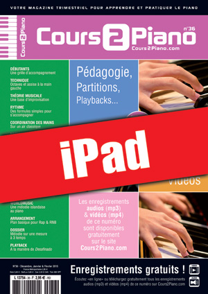Le Cours 2 Piano n°36 sur iPad. DEBUTANTS : Une grille d’accompagnement. TECHNIQUE : Octaves et assise à la main gauche. THEORIE : Une base d'improvisation. RYTHME : Des formules simples pour s’accompagner. COORDINATION DES MAINS : Sur un air classique. HARMONIE & ACCORDS : Renversements utiles. VARIETE : Lire une grille d’accords. BLUES : Les notes bleues. POP & ROCK : Une rythmique eurythmique. JAZZ : Sur un standard de Jazz. CLASSIQUE : A la découverte de la bourrée. WORLD MUSIC : Une mélodie islandaise au piano. ARRANGEMENT & PROGRAMMATION : Plan basique pour Rap & RNB. DOSSIER : Mélodie sur une mesure à 3 temps. PLAYBACK : A la manière de Desafinado.