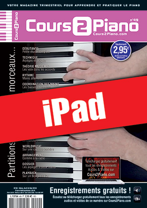 Le Cours 2 Piano n°49 sur iPad. DEBUTANTS : Petite étude complète. TECHNIQUE : Arpèges et doigtés. THEORIE : Les voix dans les accords. RYTHME : Mains alternées. COORDINATION DES MAINS : Les basses chantantes. HARMONIE & ACCORDS : Le pandiatonisme. VARIETE : Exercice de piano-chant. BLUES : Harmonies blues. POP & ROCK : Mon précieux Soprano. JAZZ : Un thème de McCoy Tyner. CLASSIQUE : En marche ! WORLD MUSIC : Sur une cadence berbère. ARRANGEMENT & PROGRAMMATION : Comme à la radio. DOSSIER : Les arpèges à deux mains. PLAYBACK : Sur un Boogie en Do.