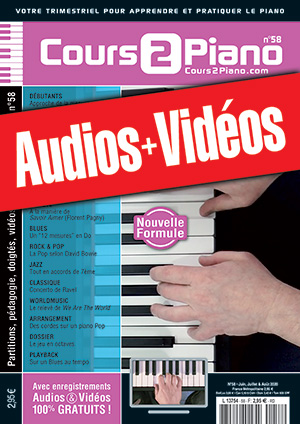 Une archive zippée contenant tous les enregistrements audios (mp3) et vidéos (mp4) gratuits qui correspondent au magazine Cours 2 Piano n°58.