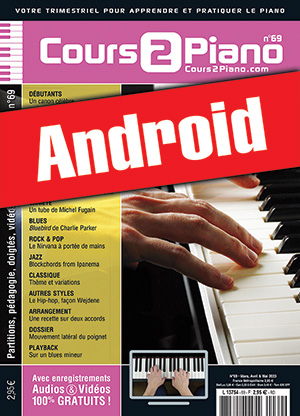 Le Cours 2 Piano n°69 en version Android. DEBUTANTS : Un canon célèbre. TECHNIQUE : Avec une quinte harmonisée. THEORIE : Tierces et sixtes consonantes. RYTHME : La notation ternaire. COORDINATION DES MAINS : Contrôle des appuis. HARMONIE & ACCORDS : Les accords de 7ème parallèles. VARIETE : Un tube de Michel Fugain. BLUES : Bluebird de Charlie Parker. POP & ROCK : Le Nirvana à portée de mains. JAZZ : Blockchords from Ipanema. CLASSIQUE : Thème et variations. AUTRES STYLES : Le Hip-hop, façon Wejdene. ARRANGEMENT & PROGRAMMATION : Une recette sur deux accords. DOSSIER : Mouvement latéral du poignet. PLAYBACK : Sur un blues mineur.