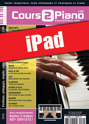 Le Cours 2 Piano n°69 sur iPad. DEBUTANTS : Un canon célèbre. TECHNIQUE : Avec une quinte harmonisée. THEORIE : Tierces et sixtes consonantes. RYTHME : La notation ternaire. COORDINATION DES MAINS : Contrôle des appuis. HARMONIE & ACCORDS : Les accords de 7ème parallèles. VARIETE : Un tube de Michel Fugain. BLUES : Bluebird de Charlie Parker. POP & ROCK : Le Nirvana à portée de mains. JAZZ : Blockchords from Ipanema. CLASSIQUE : Thème et variations. AUTRES STYLES : Le Hip-hop, façon Wejdene. ARRANGEMENT & PROGRAMMATION : Une recette sur deux accords. DOSSIER : Mouvement latéral du poignet. PLAYBACK : Sur un blues mineur.