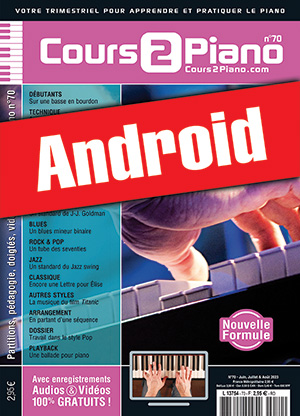 Le Cours 2 Piano n°70 en version Android. DEBUTANTS : Sur une basse en bourdon. TECHNIQUE : Avec un pouce opposable. THEORIE : La quinte magique. RYTHME : Jouer un Reggae à 3 temps. COORDINATION DES MAINS : Comment régler le problème de la régularité. HARMONIE & ACCORDS : Grille mineure et variation. VARIETE : Un standard de J-J. Goldman. BLUES : Un blues mineur binaire. POP & ROCK : Un tube des seventies. JAZZ : Un standard du Jazz swing. CLASSIQUE : Encore une Lettre pour Elise. AUTRES STYLES : La musique du film Titanic. ARRANGEMENT & PROGRAMMATION : En partant d’une séquence. DOSSIER : Travail dans le style Pop. PLAYBACK : Une ballade pour piano.