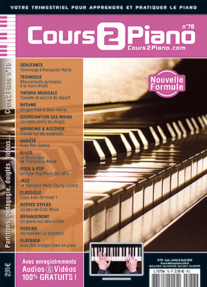 DEBUTANTS : Hommage à Françoise Hardy. TECHNIQUE : Mouvements syncopés à la main droite. THEORIE : Tonalité et accord de départ. RYTHME : Un gimmick à deux mains. COORDINATION DES MAINS : Un relais entre les doigts. HARMONIE & ACCORDS : Travail sur les cadences. VARIETE : Avec Phil Collins. BLUES : Le Blues/Jazz de Thelonious Monk. POP & ROCK : Un tube Pop/Rock des 60’s. JAZZ : Le standard Hello Young Lovers. CLASSIQUE : Vous avez dit tonal ? AUTRES STYLES : Un peu de Cool Wave. ARRANGEMENT & PROGRAMMATION : Un piano sur des cordes. DOSSIER : Harmoniser un standard. PLAYBACK : Avec des arpèges bien en place.