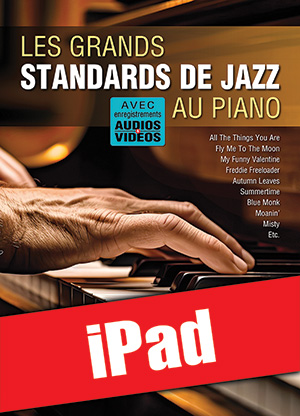 Composée d’une dizaine de standards de jazz, parmi les plus connus et les plus joués au piano, cette méthode vous permettra de vous construire un véritable «répertoire» dans le style : All The Things You Are, Fly Me To The Moon, Tenor Madness, My Funny Valentine, Summertime, Autumn Leaves, Blue Monk, Moanin’, Misty, etc. Et ce, quel que soit votre niveau, puisque chaque standard y est proposé en deux versions différentes : une première version abordable par le plus grand nombre ; puis une deuxième version, enrichie, aussi bien du point de vue harmonique que rythmique. L’idée ici est évidemment de satisfaire tous les niveaux, mais pas seulement. Les passerelles entre ces versions vous montreront, par la pratique, comment faire évoluer une même grille d’accords de jazz. N’est-ce d’ailleurs pas le propre des standards, que de laisser une grande liberté à l’interprétation ? Et pour mettre tout cela en place rythmiquement, vous disposerez d’autant de playbacks qu’il n’y a de versions, et ce à deux tempi différents, pour s’adapter aux besoins de tous. Pour vous laisser toute la place nécessaire, ces playbacks ont été conçus dans l’esprit d’un trio de jazz (piano, basse, batterie), avec occasionnellement une guitare rythmique en soutien. A ces enregistrements audios viennent bien sûr s’ajouter les vidéos des 20 versions, là encore à deux tempi différents (soit 40 vidéos en tout), afin de pouvoir découvrir en images comment les jouer... et les mettre en place sur les playbacks.