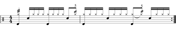 Vediamo ora lo spartito di questo ritmo di batteria che si estende su due battute: